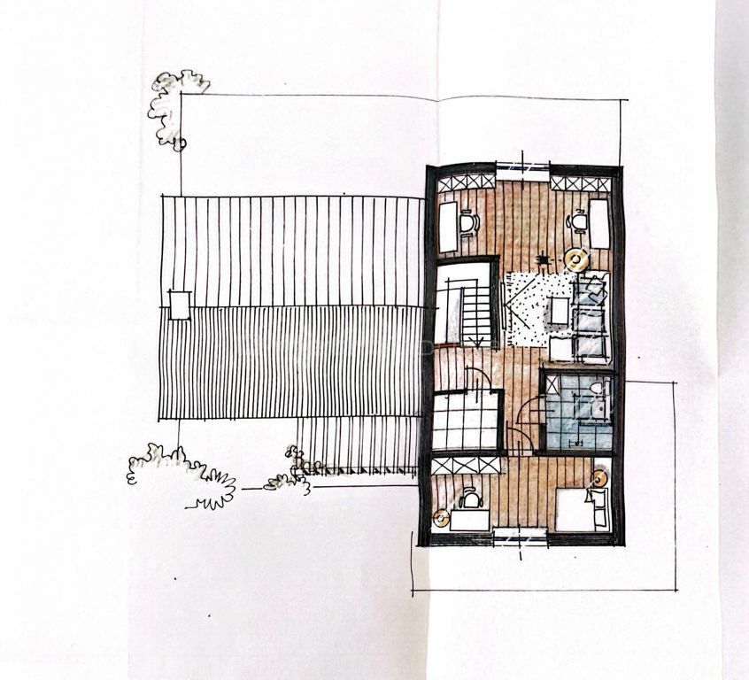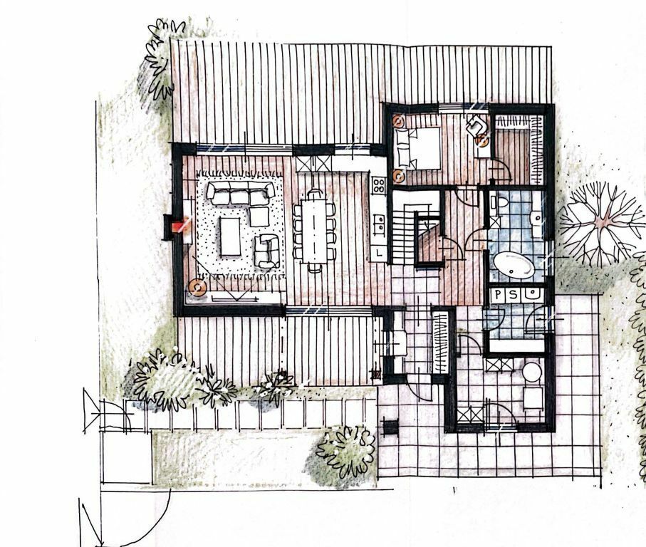 Pomieszczenia: salon z aneksem kuchennym z wyjściem na taras, spiżarnia, 2 sypialnie, garderoba, 2 łazienki, część wspólna na poddaszu, przedpokój, kotłownia, pomieszczenie gospodarcze,